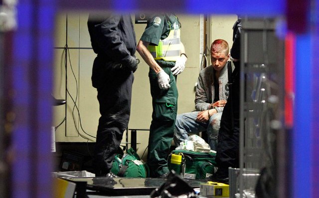 26 Раненому оказывают первую помощь после ареста за мародерство в магазине электроники, южный Лондон, 8 августа 2011 года. (AP Photo / Simon Dawson) #