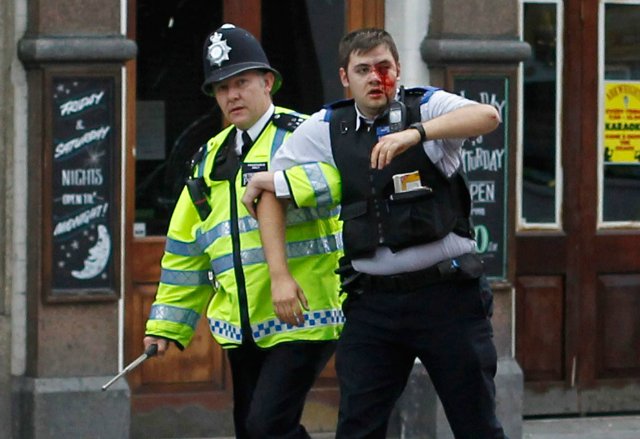 15 Полицейский помогает раненому офицеру, во время столкновений в Кройдоне, южный Лондон, 8 августа 2011 года. (AP Photo / Sang Tan) #