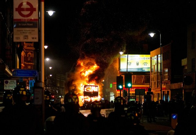 4 Двухэтажный автобус горит на Tottenham High Road, где полиция пытается сдержать большую толпу людей. Лондон, 6 августа 2011 года. (Leon Neal / AFP / Getty Images) #