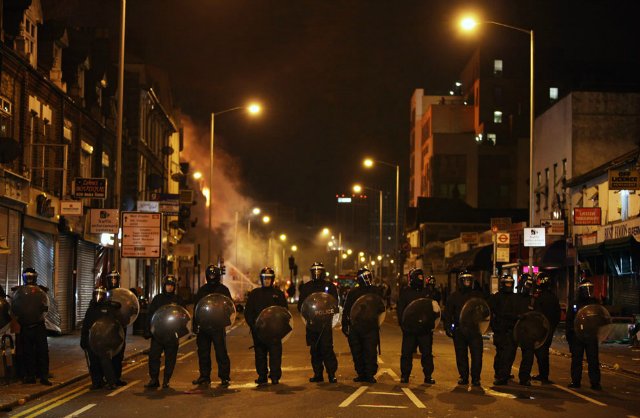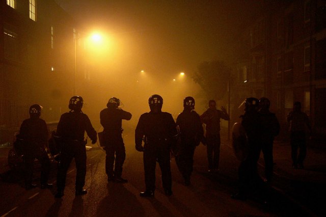 10 Полицейский спецназ встречает толпу в Хакни, на севере Лондона 8 августа 2011 года. Полиция померилась силами с молодежью в новых столкновениях сегодня в Лондоне, на третий день после начала худших за многие годы беспорядков в британской столице. (Ki Price/AFP/Getty Images) #