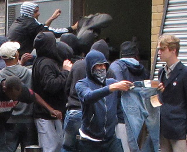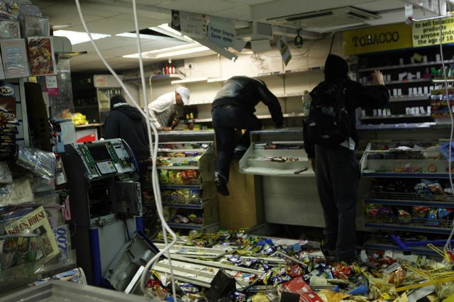 18 Мародеры бесчинствуют в магазине в Хакни, восточный Лондон 8 августа 2011. Молодёжь бросала камни в полицейских на северо-востоке Лондона в понедельник, когда беспорядки вспыхнули в британской столице на третью ночь. (Reuters / Olivia Харрис) #