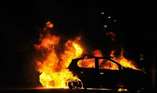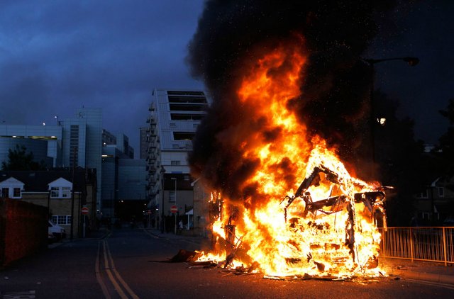 34 Автомобиль горит на улице в Ealing, Лондон, 9 августа 2011 года. Поздно вечером в понедельник, на третью ночь бесчинств, в которых полиция обвинила уголовников, грабежи распространились на Ealing в Западном Лондоне и Камден на севере британской столицы. (REUTERS / Toby Melville) #