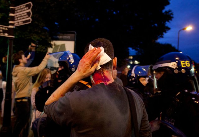 22 Фотограф держится за голову после того как он подвергся нападению протестующих в Хакни, Ист-Лондон, 8 августа 2011 года. (AP Photo / Karel Prinsloo) #