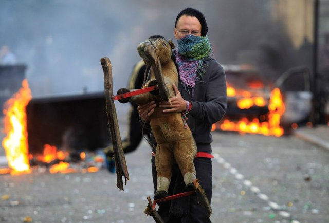 24 Человек в маске несет игрушку, у него за спиной горят мусорные баки и автомобиль подожжённые участниками массовых беспорядков в Хакни, восток Лондона, понедельник 8 августа 2011. (AP Photo / Lefteris Pitarakis) #