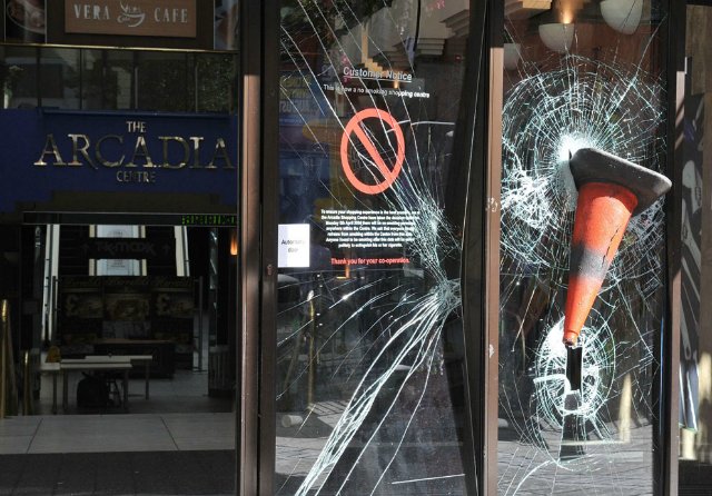37 Конус дорожного ограждения в разбитом окне торгового центра Arcadia на Ealing Broadway, на следующий день после беспорядков в Ealing , 9 августа 2011 года, Лондон, Англия. (Jim Dyson / Getty Images) #