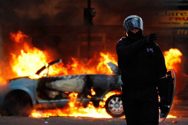 12 Офицер спецназа направляет коллег, чтобы убрать людей от горящего автомобиля на Кларенс-роуд в Хакни 8 августа 2011 года в Лондоне, Англия. (Dan Istitene / Getty Images) #
