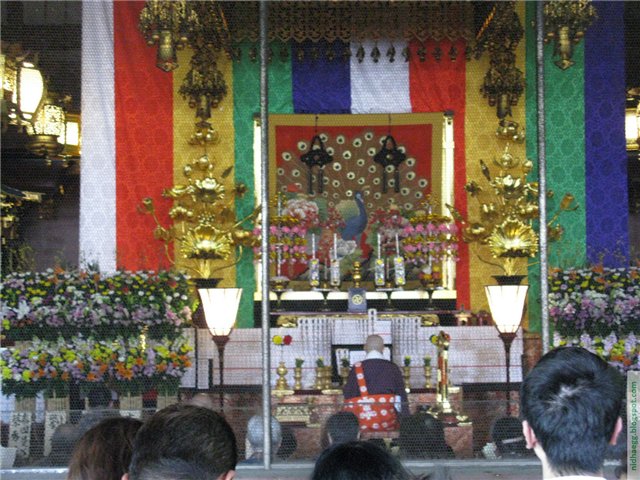 Уже после лестницы, перед самим входом в храм толпилась куча людей и слышался звон монет. Я уж грешным делом подумал, что за вход берут деньги, но оказалось, что там стоит здоровенная бетонная емкость, в которую верные прихожане кидают мелочь и молятся. Обойти их и тихонько пройти без монетарных взносов не возбраняется. В храме шла служба/месса/обряд (?), вместо колокольного перезвона был барабанный перестук, священник замер лицом к символам, спиной к народу. Фотографировать никто не мешал, бдительные буддисткие старушки за руки не хватали и змеями не шипели.