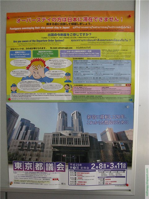 В здании мэрии висит плакат, призывающий нелегалов, в том числе и просто людей с просроченными визами, сдаться властям и покаяться. Мол, даже штрафовать не будут, только депортируют и на год забанят от въезда в Японию.