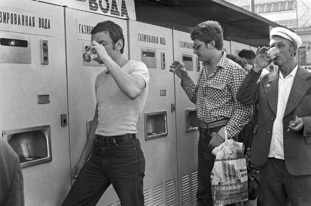 В 1960-х, общественные автоматы по продаже газированной воды можно было увидеть в любом продуктовом магазине или столовой. Стакан просто газированной воды стоил 1 копейку, стакан воды с сиропом – 3, сами стаканы были общие. "Добывание (бесплатно) стакана воды из автомата стало национальным видом спорта. Существовало много способов: монета на леске, поддельные монеты-жетоны и самый примитивный и удивительно эффективный метод - просто сильно ударить по автомату в нужном месте .... В общем, была этическая, а также - гигиеническая катастрофа ".