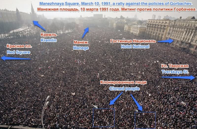 Друзья! В последние дни эту старую фотографию выдают за "фото митинга против Путина". Вот так, не стесняясь вместо Болотной 2012-го подсовывают людям Манежную 1991-го.