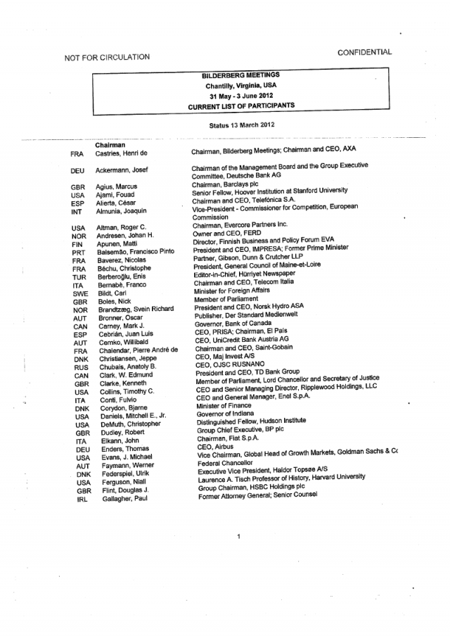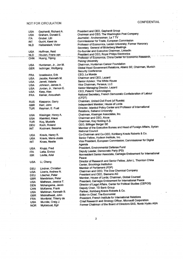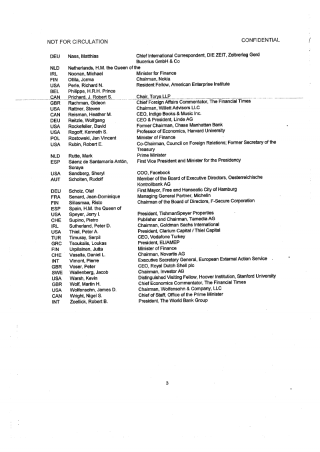Среди других участников конференции 2012 года были президенты ECB и Всемирного банка, королева Нидерландов и наследный принц Бельгии, три комиссара Евросоюза и руководители многих ведущих компаний в мире включая Google и Голдман Сакс.