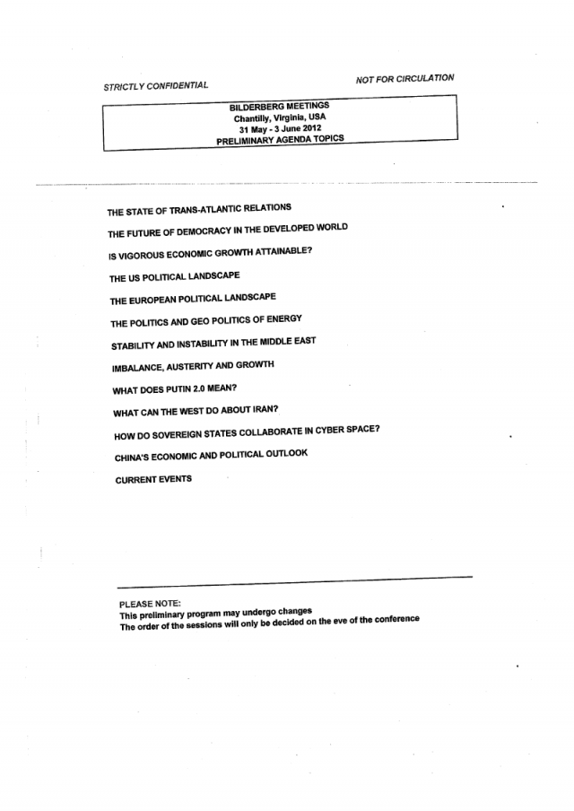 Также, предварительная программа конференции отличается от изданной официальной 'заключительной' версии . Среди тем предварительно предложенных для обсуждения были «Трансатлантические отношения», «Путин 2.0», «Энергетические политика и геополитика», «ядерная угроза Ирана», «нестабильность на Ближнем Востоке» и «экономические и политические перспективы Китая». Темы, перечисленные как обсуждаемые, но не включенные в первоначальный перечень, включают в себя «американскую внешнюю политику» и «обсуждение устойчивости евро».
