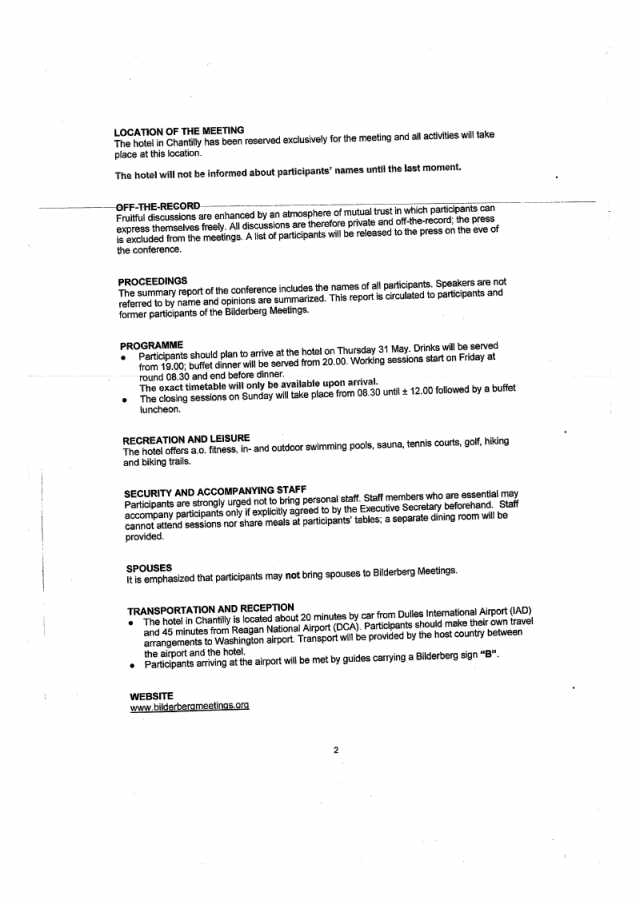 Они также предоставляют ранее неподтверждавшиеся детали протокола и методики проведения встречи «только-для-приглашенных» (см. фото 2 и 3), секретность этой встречи часто служит почвой для обвинений, что конечной целью группы является - или продвижение капитализма во всем мире или формирование единого глобального правительства.