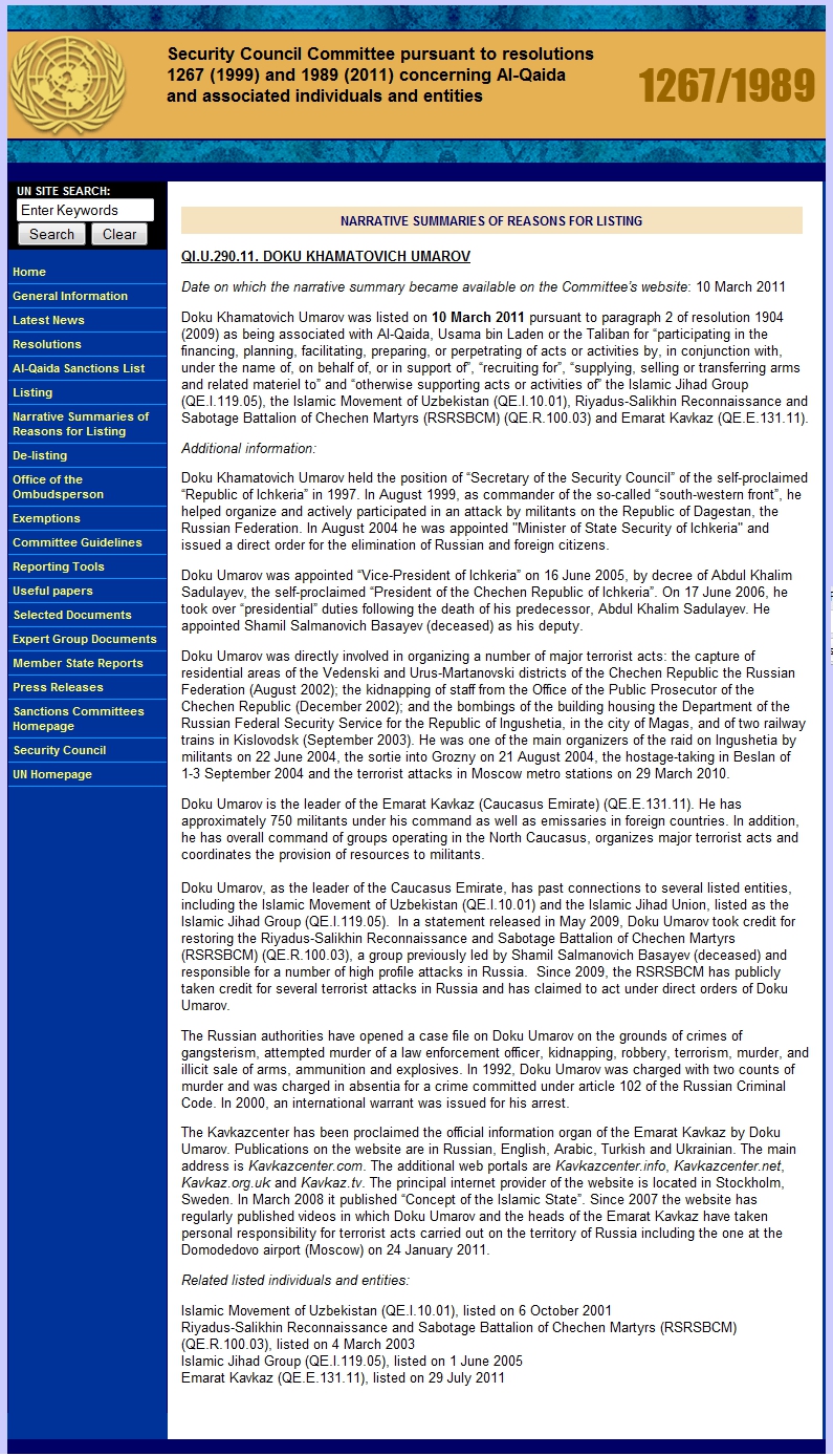 С сайта http://www.un.org/sc/committees/1267/NSQI29011E.shtml , чеченский лидер боевиков Доку Умаров был официально внесен в список террористических организаций, имеющих связи с Аль-Каидой. Как ни парадоксально, США финансирует расходы на поддержку террористической кампании Умарова против правительства России. В международном списке перечислены имена террористов, подобные исламским ливийским боевикам, которые в настоящее время воюют в Сирии, получают американкое финансирование и поддержку, что является прямым нарушением американского и международного права.