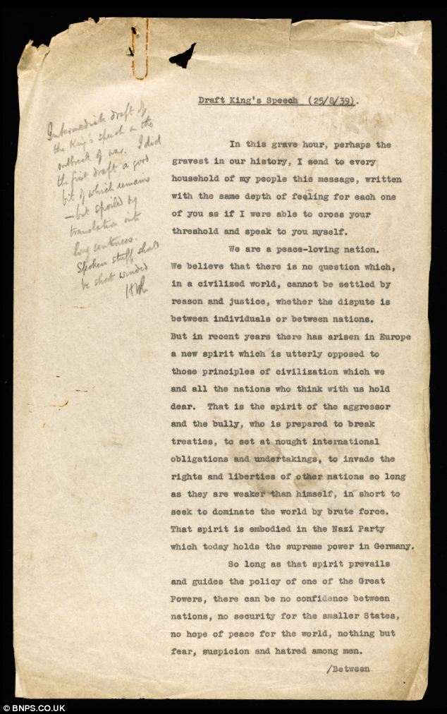 Эта ранняя версия речи короля, объявляющая о начале войны, была написана как минимум за девять дней до обращения Георга VI к нации.