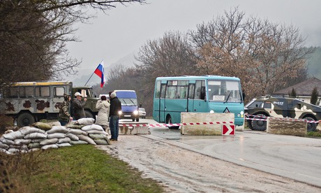 Люди создают барьер на дороге Симферополь-Севастополь в Крыму, Украина. Фотография: Anton Pedko/EPA