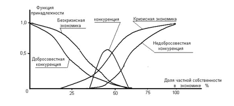На рисунке 1 показано как меняется возможность (не вероятность) проявления тех или иных ситуаций в экономике. Например, при доле частной собственности 0 % возможна только бескризисная экономика – на протяжении 70 лет в СССР не было кризисов, но уже при 20 % и выше, где-то до 40 % в экономике возможны и кризисные явления. При 60 % доли частной собственности экономика возможна только кризисная. При частной собственности менее 75 % можно говорить, что экономика несколько устойчивее. При 50% - экономика склонна к кризисам на уровне 0,5, а при 20 % доли частной собственности кризисов, по мнению автора, вообще не будет. Если бы доля частной собственности в экономике США была на уровне европейской, возможность кризиса 2007, 2008 … г. г. и не было бы, а так имеем то, что имеем.Несколько круче спад функций принадлежности нечеткого множества “конкуренция”. Это связано с общей высокой долей эгоистических проявлений в обществе. Просто конкуренция или “законная” конкуренция – так как она сформулирована в законе “О защите конкуренции” представляет собой объединение функций принадлежности добросовестной и недобросовестной конкуренций (см. рисунок 1). В различных странах доля частной собственности разная, а это значит, что в них и разные экономики. Можно увеличивая число элементов нечеткого множества “экономика”, например, “слабо кризисная”, “неустойчивая к кризисам” и т. п., получить множество экономик, что и есть в реальности. Безусловно, можно смещать эти кривые вправо или влево, но суть останется прежней.