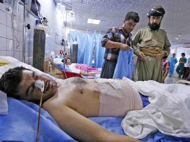Курдский боец пешмерга, раненый в стычках с ИГИЛ, лежит на кровати в пункте скорой помощи госпиталя в Эрбил