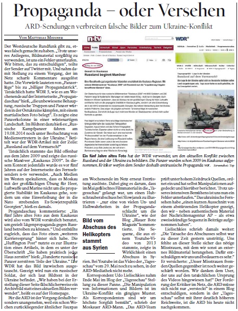 Это происшествие тем более особо неприятно для WDR, так как несколько недель назад одни допустили похожий возмутительный казус. Тогда речь шла о том, что сфальсифицированный в мае киноматериал очутился в Tagesschau как иллюстрация вертолетного обстрела Славянска – «еще одна неправда или полуправда в пропагандистской бойне вокруг Украины», так прокомментировал ситуацию блог «Blauer Bote Magazin”. На самом же деле на этом видео был показан обстрел в Сирии. На канале Tagesschau мы еще можем видеть это видео – запись 29 августа, из медиатеки ARD оно уже было удалено.