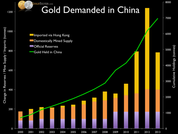 Все большие шишки находятся там - HSBC, Goldman, ANZ, и т.д. Плюс, недавно мы видели еще больше фактических свидетельств того огромного аппетита на физическое золото, который испытывают китайцы. Всё это вместе - новые хранилища и открытие Шанхайской биржи золота для международных инвесторов, говорит мне, что китайцы готовят почву для доминирования на рынке золота в будущем, и, одновременно, они продолжают скупать все доступные на мировом рынке поступления металла.