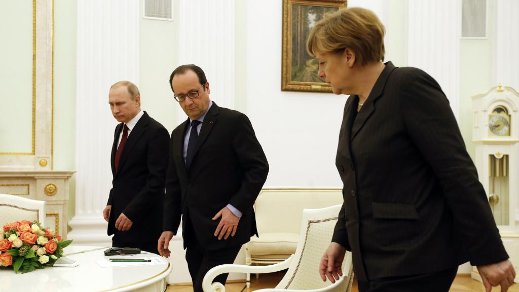 Президент России Владимир Путин, президент Франции Франсуа Олланд и канцлер Германии Ангела Меркель на переговорах в Москве, 6 февраля 2015 г. REUTERS/Maxim Zmeyev