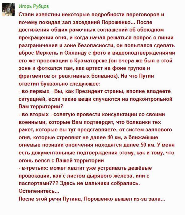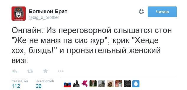 "Олланд и Меркель беседуют с Путиным с глазу на глаз. Даже без переводчиков."и еще...