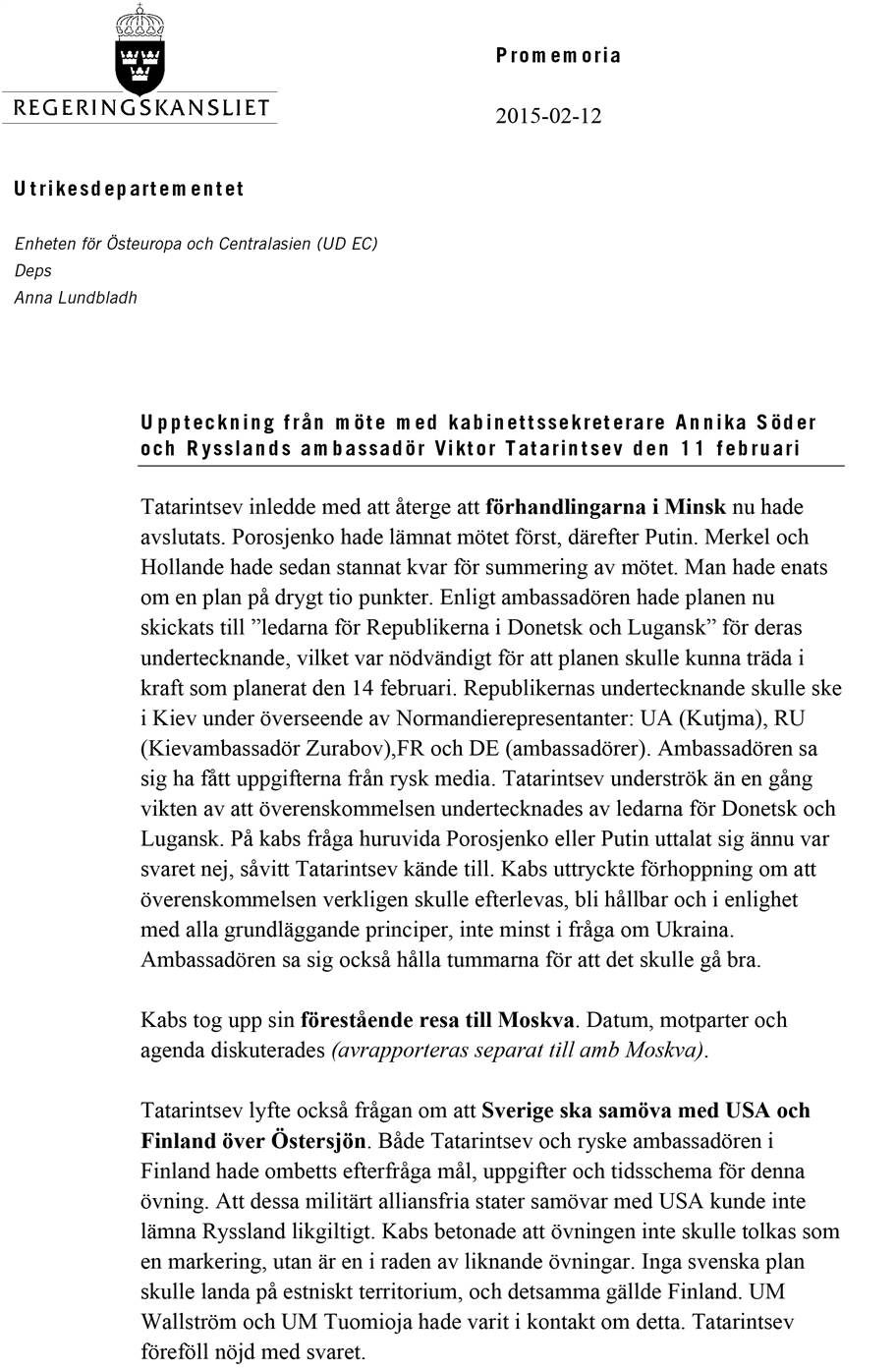 «Татаринцев также поднимал вопрос об участии Швеции в совместных учениях с США и Финляндией над Балтийским морем. И Татаринцев и российский посол в Финляндии получили задание узнать цели, задачи и временной график проведения указанных учений».