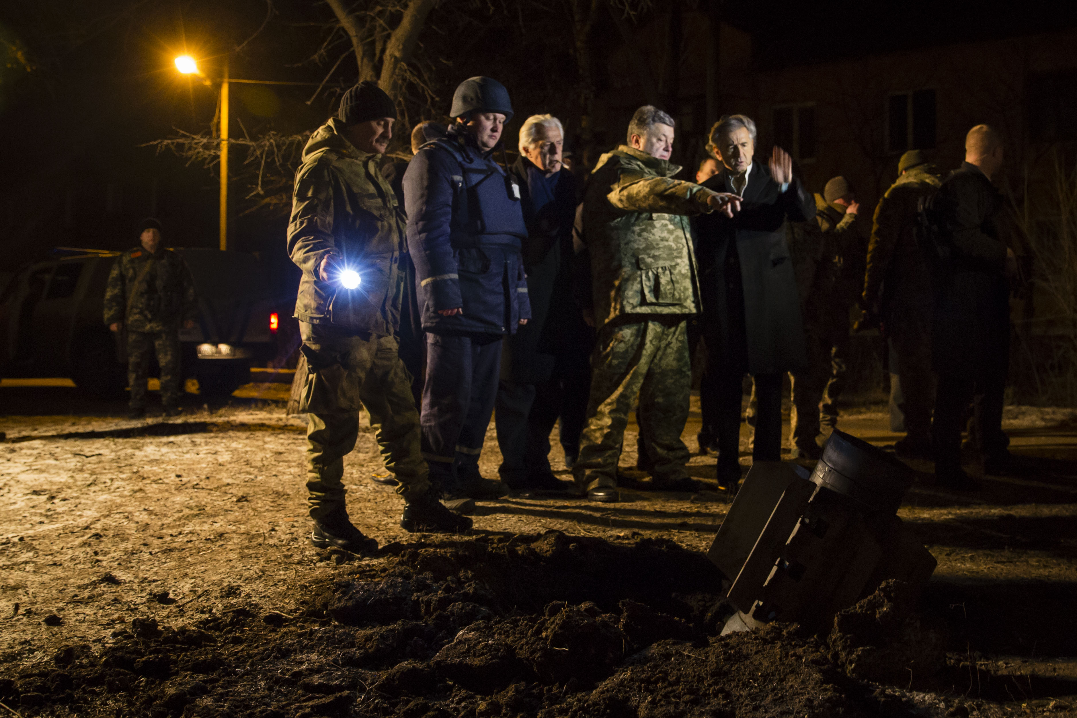 «Какая беда», – бормочет Порошенко. Он повторяет много раз: «Это катастрофа… мы за много километров от фронта. Тут только гражданские. Это не война, а бойня. Это не военное преступление, это – преступление против человечества». Затем он останавливается на краю кратера, где лежит неразорвавшийся снаряд. Из-за пуленепробиваемого жилета, который надет под гимнастеркой, он кажется странным колоссом. Он добавляет, указывая пальцем на смертоносную бомбу, словно она является его личным врагом: «У сепаратистов нет монстров такого размера, запрещенных Женевской конвенцией, это может быть только делом рук русских». Кривая ухмылка искажает его лицо: «Русские… Когда я думаю о том, что они будут через несколько часов в Минске и что у них хватит смелости говорить о мире…»