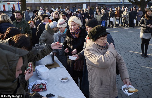 Пророссийские жители Донецка получают бесплатную еду во время митинга, на праздновании российского праздника «Дня Защитника Отечества' в Донецке, Украина, вчера