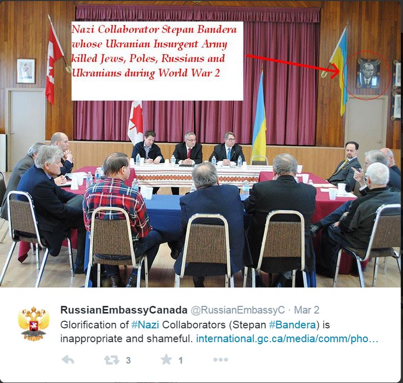 Также, на этой неделе, российское посольство выложило в Твиттере фотографию встречи министра международной торговли Эда Фаста и членов парламента от консервативной партии Теда Опица и Бернарда Тротье с украинскими канадцами в Торонто. Фотография изменена таким образом, чтобы выдвинуть на первый план висящий на задней стене портрет спорной украинской фигуры Степана Бандеры.
