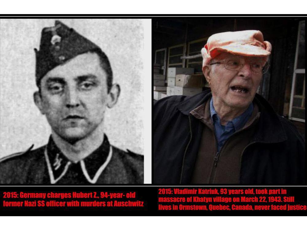 Справа: 2015 год - Владимир Катрюк, 93 года, принимавший участие в кровавой расправе на деревней Хатынь 22 марта 1943 года, живёт в городе Ормстаун, Квебек, Канада, никогда никаких обвинений не предъявлялось