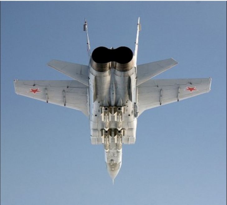An armed MiG-31 Foxhound photographed from below by a Norwegian Royal Air Force interceptor.