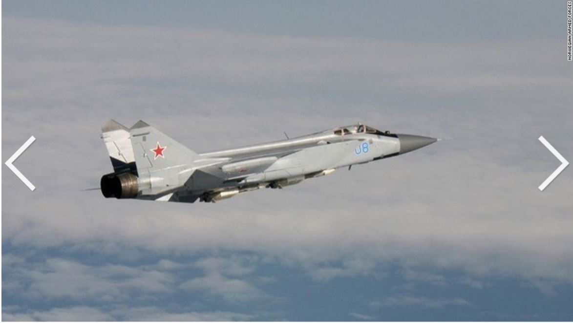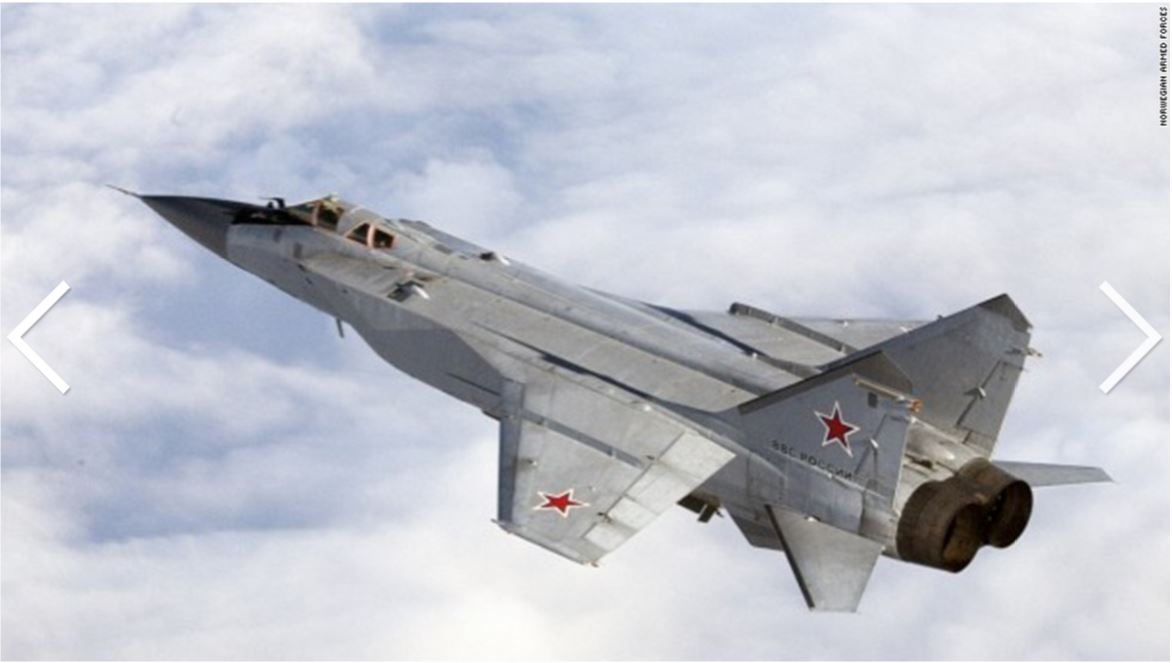 An armed MiG-31 intercepted by Norwegian planes. The plane is nicknamed the Foxhound by NATO.