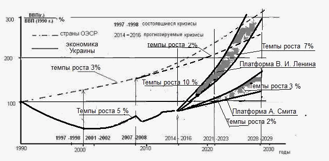 Рисунок 1. Зависимость изменения относительных ВВП во времени стран ОЭСР с экономикой на платформе А. Смита и Украины с экономикой на платформах А. Смита и В, И. ЛенинаНа рисунке также представлены состоявшиеся кризисы и предполагаемые, по мнению автора. Кризис 2014 – 2016 гг. на рисунке представлен как предполагаемый – нет данных о состоянии экономики. Идея рисунка была впервые опубликована в середине 90 – х прошлого века, а с кризисами в 2009 г., т. е. начало последнего кризиса автор угадал, а конец – посмотрим. К 2030 г. предполагается ещё два кризиса в 2021 – 2023 гг. и 2028 – 2029 гг. Обычно в прогнозах различных экономических органов о кризисах на такую перспективу ничего не говорят. Даже такая сравнительно простая картинка показывает, что при развитии экономики на платформе А. Смита Украина не сравняется с группой стран (с Европой). Видимо такая же ситуация со всеми странами Восточной Европы как бывшими странами соцлагеря.