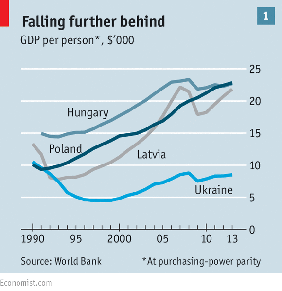В 1990-е Украина не получала пользы от такой помощи. Вместо этого ее экономика завязла в халтурной приватизации и коррупции (все это хорошо объясняется в новой книге Андерса Аслунда из аналитического центра "Атлантический Совет"). Она меньше продвинулась по пути реформ, чем Польша (см. ряд графиков ниже).