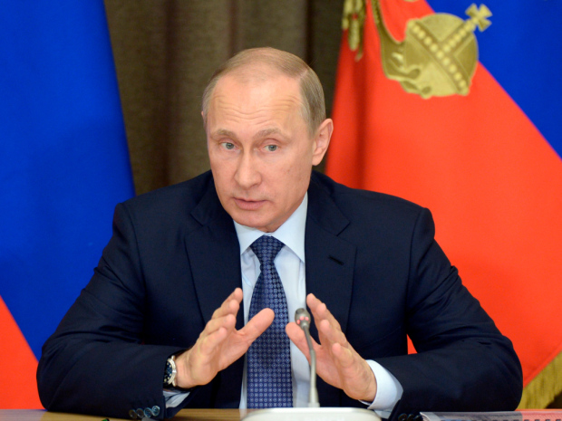В этом снимке от 12 мая 2015 г., сделанном в резиденции Бочаров ручей на черноморском курорте Сочи, президент России Владимир Путин говорит на встрече с представителями высшего военного руководства и оборонной промышленности. 23 мая 2015 г., Путин подписал закон, предоставивший прокуратуре власть объявить иностранные и международные организации "нежелательными" в России и закрыть их.