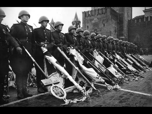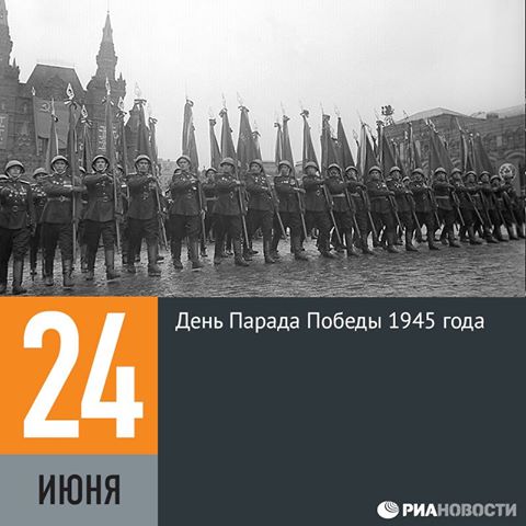 24 июня 1945 года в 10 часов утра Маршал Советского Союза Георгий Жуков выехал на белом коне из Спасских ворот на Красную площадь Москвы. После команды «Парад, смирно!» площадь взорвалась гулом аплодисментов. Командующий парадом Константин Рокоссовский представил Георгию Жукову рапорт, а потом они вместе начали объезд войск. Из Берлина также привезли Красное знамя Победы, которое было водружено над рейхстагом. Вслед за полками фронтов и ВМФ на Красную площадь вступила сводная колонна советских воинов, которые несли опущенные до земли 200 знамен немецко-фашистских войск, разгромленных на полях сражений. Под барабанный бой эти знамена были брошены к подножию Мавзолея. http://ria.ru/