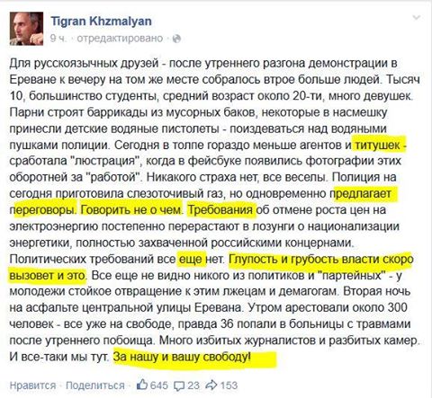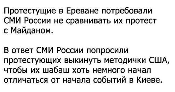 Армения нужна России лишь для своей военной базы и как пешка в её великих имперских планах . Но мы хотим жить в стране , а не в русских казармах . Когда полиция использует водомёты — мы показываем им наши средние пальцы . И я скажу вам , как Ереванский майдан начнётся - нами , показывающими им палец . Мои друзья и я были избиты резиновыми дубинками, но это не остановит нас .»--skip--