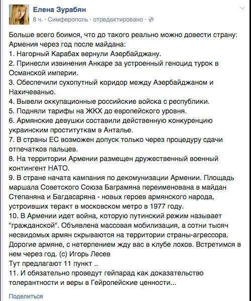 "Список будущих «достижений» армянской «революции достоинства» спустя год после ее гипотетической победы. В частности, он полагает, что новые армянские власти вернут Нагорный Карабах Азербайджану, принесут извинения Анкаре за устроенный геноцид турок в Османской империи, поднимут тарифы ЖКХ до европейского уровня, разместят в стране контингент НАТО и развяжут гражданскую войну."