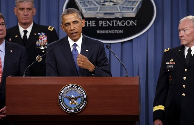 Рядом с президентом США Бараком Обамой стоят министр обороны Эш Картер (слева), генерал Дэвид Родригес (второй слева) и председатель Объединенного комитета начальников штабов генерал ВС США Мартин Демпси (справа), в то время как он выступает с речью после брифинга об усилиях США против ИГИЛ, в Пентагоне в Арлингтоне 6 июля 2015 г. Фото Рейтер/Джонатан Эрнст