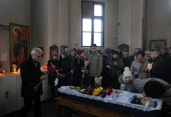 Писатель-диссидент и критик Путина Эдуард Лимонов, слева, на похоронах человека, названного российским добровольцем, который был убит во время боев в Дебальцево, в восточной Украине, в феврале. Фотография - Анатолий Мальцев/European Pressphoto Agency