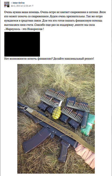 Про-российская группа, борющаяся за контроль над украинским портовым городом Мариуполь, обращалась с призывом о пожертвованиях для приобретения снаряжения в ВКонтакте, самой популярной социальной сети России. Она написала, что "помощь очень нужна" и перечислила способы перевода денег, которые "Таймс" цензурировала.