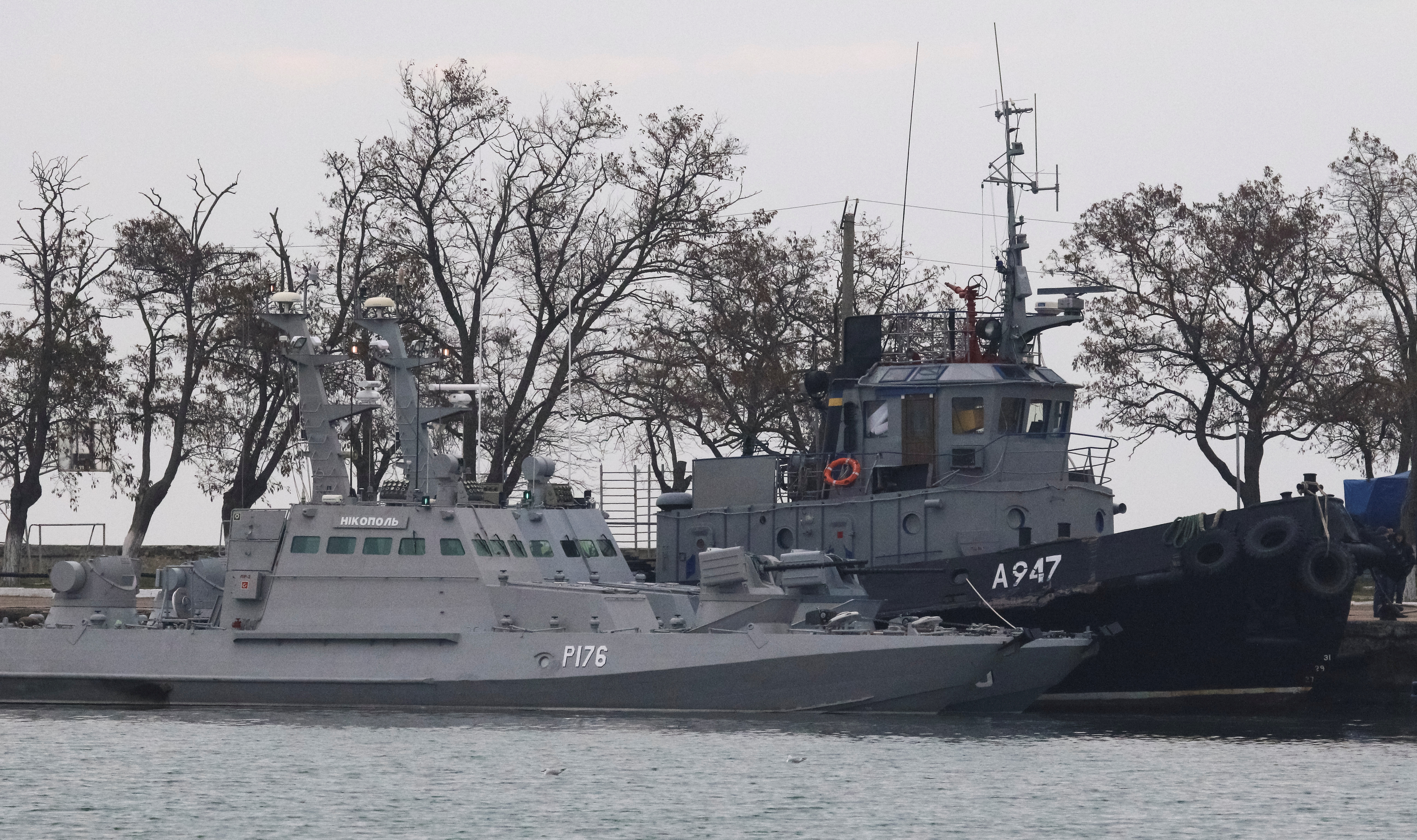 Захваченные украинские корабли, небольшие бронированные артиллерийские корабли и буксирный катер, видны стоящими на якоре в порту Керчи, Крым, 26 ноября 2018 г. "Рейтер"/Павел Ребров