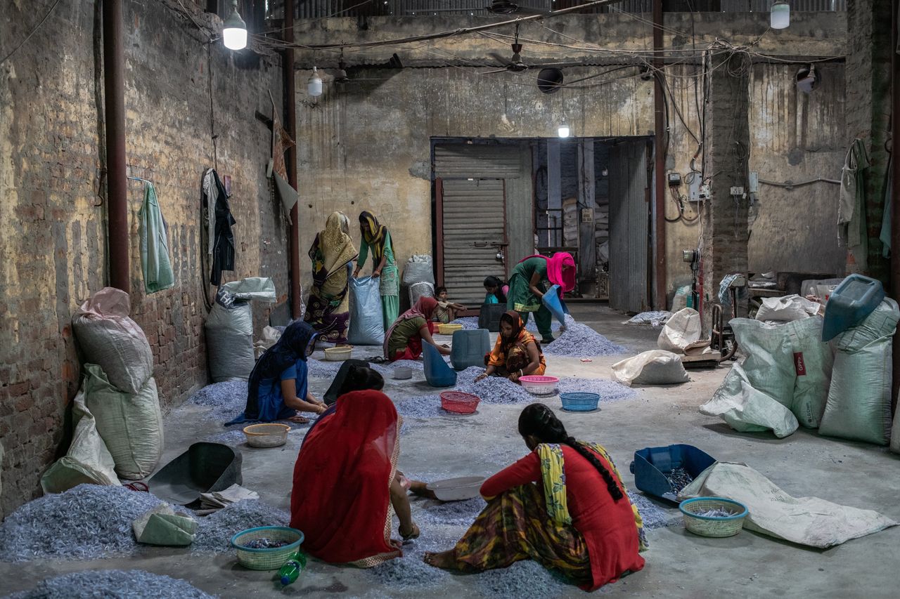 Женщины сортируют фрагменты расщепленных пластмассовых ручек на фабрике в пригороде Нью-Дели, в то время как мужчины занимаются отбеливанием осколков. Фото: Ребекка Конуэй для "Уолл Стрит Джорнал"