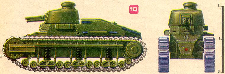 Лёгкий танк Т-26: масса 9,4 т, экипаж 3 чел, вооружение: 45 мм пушка, пулемёт 7,62 мм ДТ, броня 10-20 мм, мощность двигателя 97 л.с., максимальная скорость 30 км/час