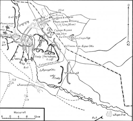 Однако выполнить свой замысел японцам не удалось. Отряд подполковника Адзума, двигавшийся по восточному берегу Халхин-Гола, попал под огонь артиллерийского дивизиона 6-й монгольской кавалерийской дивизии.