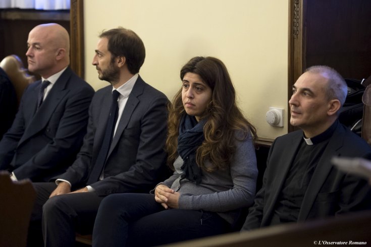 Испанский монсеньер Анхель Вальехо Бальда (справа), Франческа Каоуки и журналисты Эмилиано Фиттипальди и Джанлуиджи Нуцци во время судебного заседания в Ватикане (Рейтер)