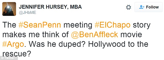 Твит: "История встречи Шона Пенна с Эль Чапо напоминает мне фильм Бена Аффлека "Операция Арго". Его обманули? Голливуд на помощь?"