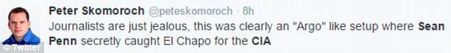Твит: "Журналисты просто завидуют, это был явно план по типу "Операции Арго", по которому Шон Пенн тайно поймал Эль Чапо для ЦРУ"