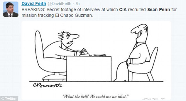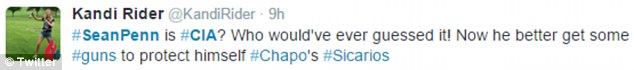 Твит: "Шон Пенн агент ЦРУ? Кто бы мог себе представить! Теперь ему лучше найти охрану, чтобы защититься от убийц Чапо"